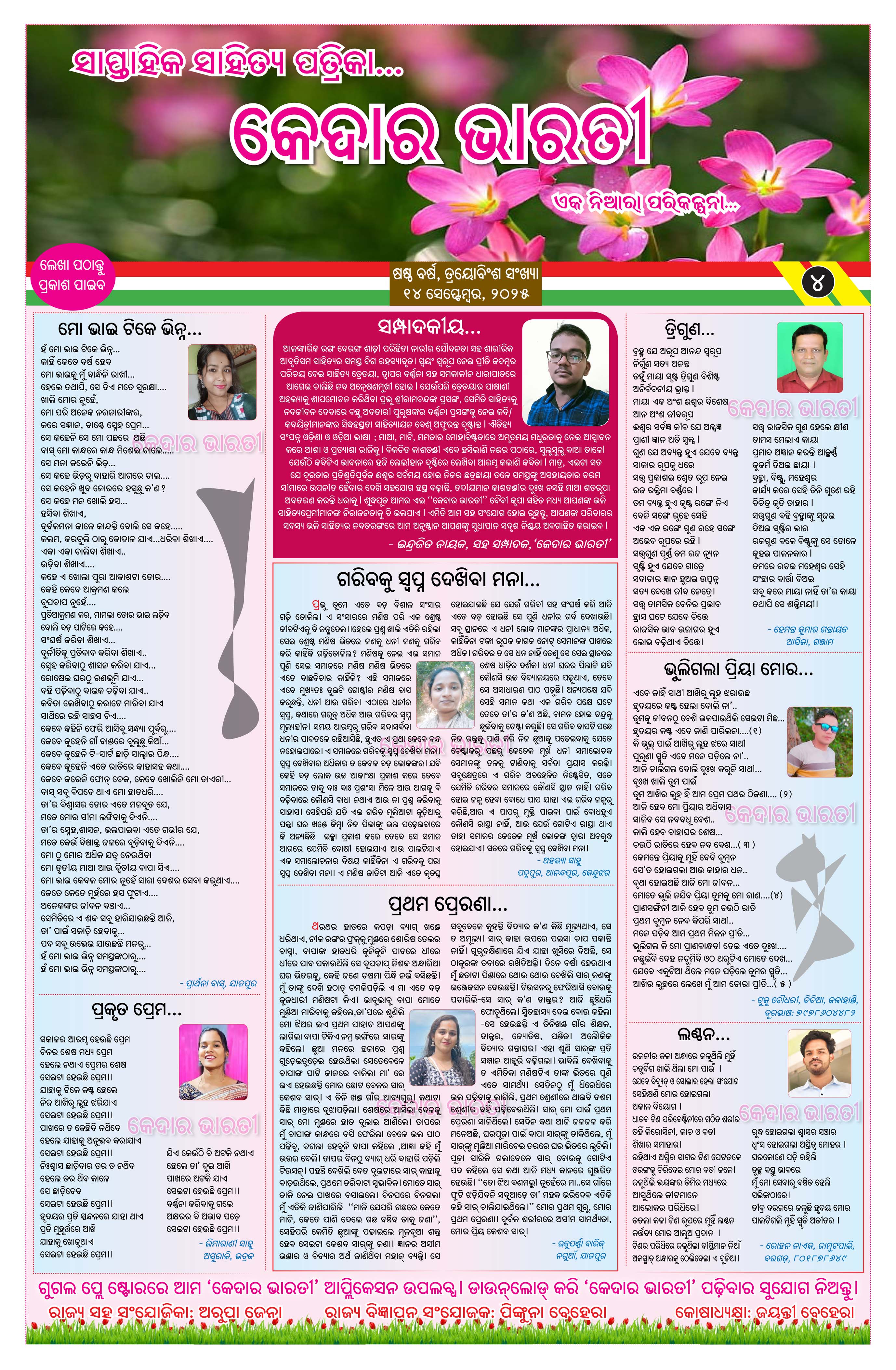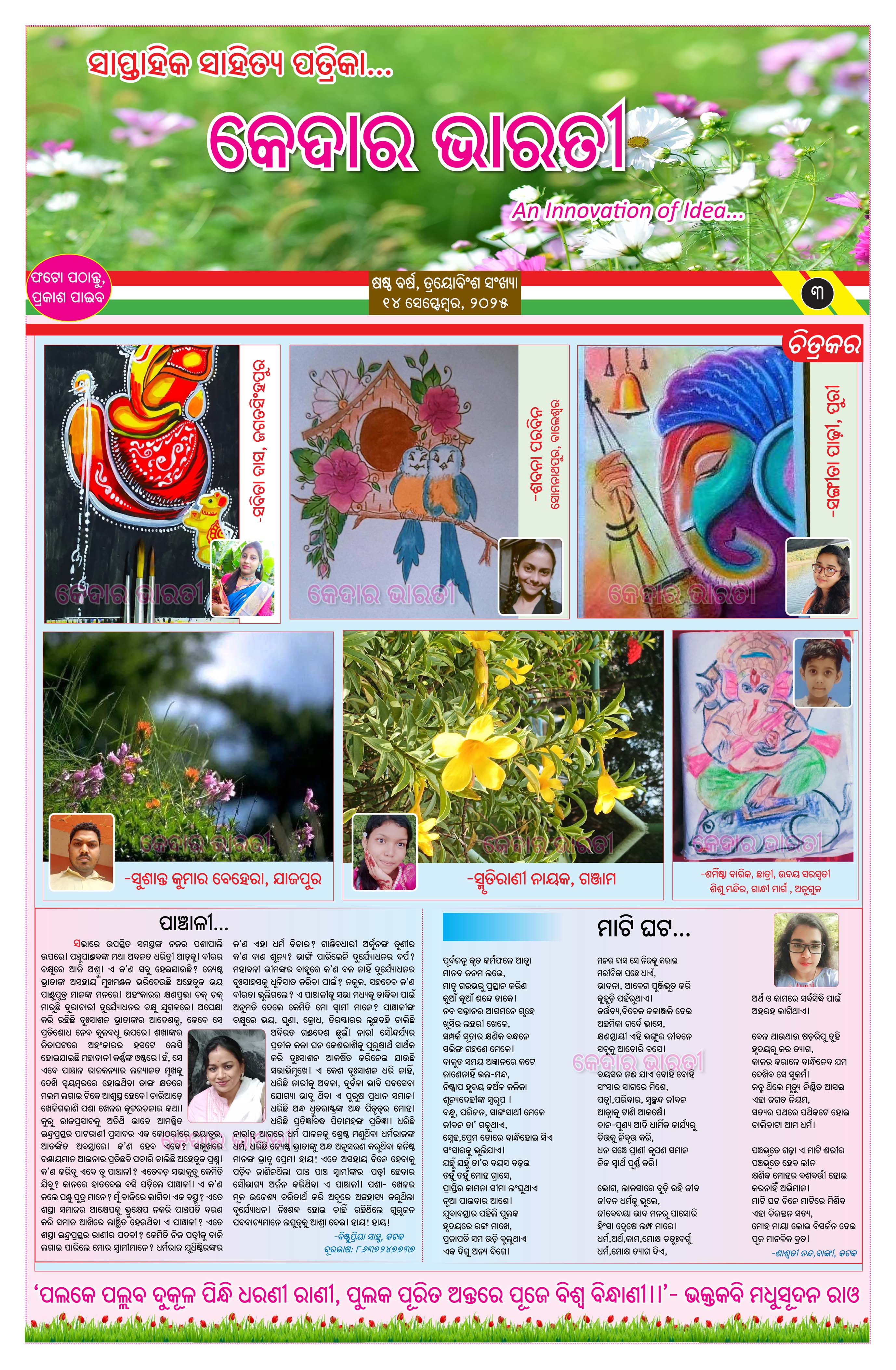 ପ୍ରକାଶ ପାଇଲା କେଦାର ଭାରତୀ ସାପ୍ତାହିକ ସାହିତ୍ୟ ପତ୍ରିକାର ଷଷ୍ଠ ବର୍ଷର ତ୍ରୟୋବିଂଶ ସଂଖ୍ୟା। ଏହି ସଂଖ୍ୟାଟି ପାଠକୀୟ ରୁଚି ଅନୁଯାୟୀ ଉପସ୍ଥାପନ କରାଯାଇଛି। ଏଥିରେ ଏକ ସୁନ୍ଦର ପ୍ରଚ୍ଛଦ ସାଙ୍ଗକୁ କବିତା,ଗଳ୍ପ ଓ ପ୍ରବନ୍ଧଗୁଡ଼ିକର ସୁନ୍ଦର ଅଳଙ୍କରଣ କରଯାଇଥିବା ବେଳେ ବିଶେଷ କରି ଚିତ୍ରାଙ୍କନ ଓ କୁନି ମଡେଲ ଇତ୍ୟାଦିକୁ ସ୍ଥାନିତ କରାଯାଇଛି। ତେବେ ପତ୍ରିକାର ସ୍ୱତନ୍ତ୍ରତା ବଜାୟ ରଖିବା ପାଇଁ ଆମେ ଏଥିରେ ଜଳାଙ୍କ(ୱାଟର ମାର୍କ) ରଖିଛୁ। ଆଶା କରୁଛୁ ଏହି ସଂଖ୍ୟାଟି ପାଠକୀୟ କ୍ଷୁଧା ମେଣ୍ଟାଇବାରେ ସଫଳ ହେବ।