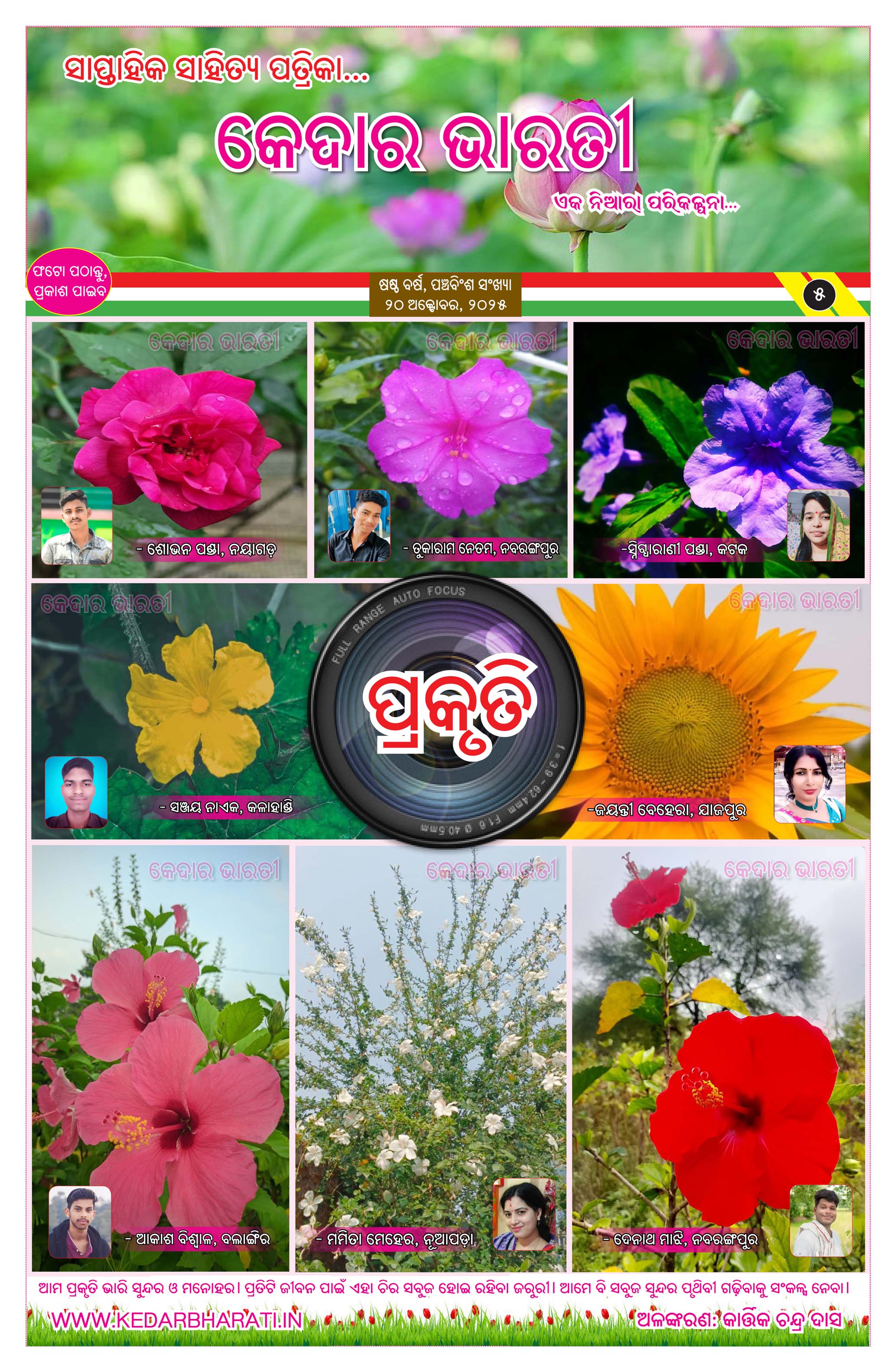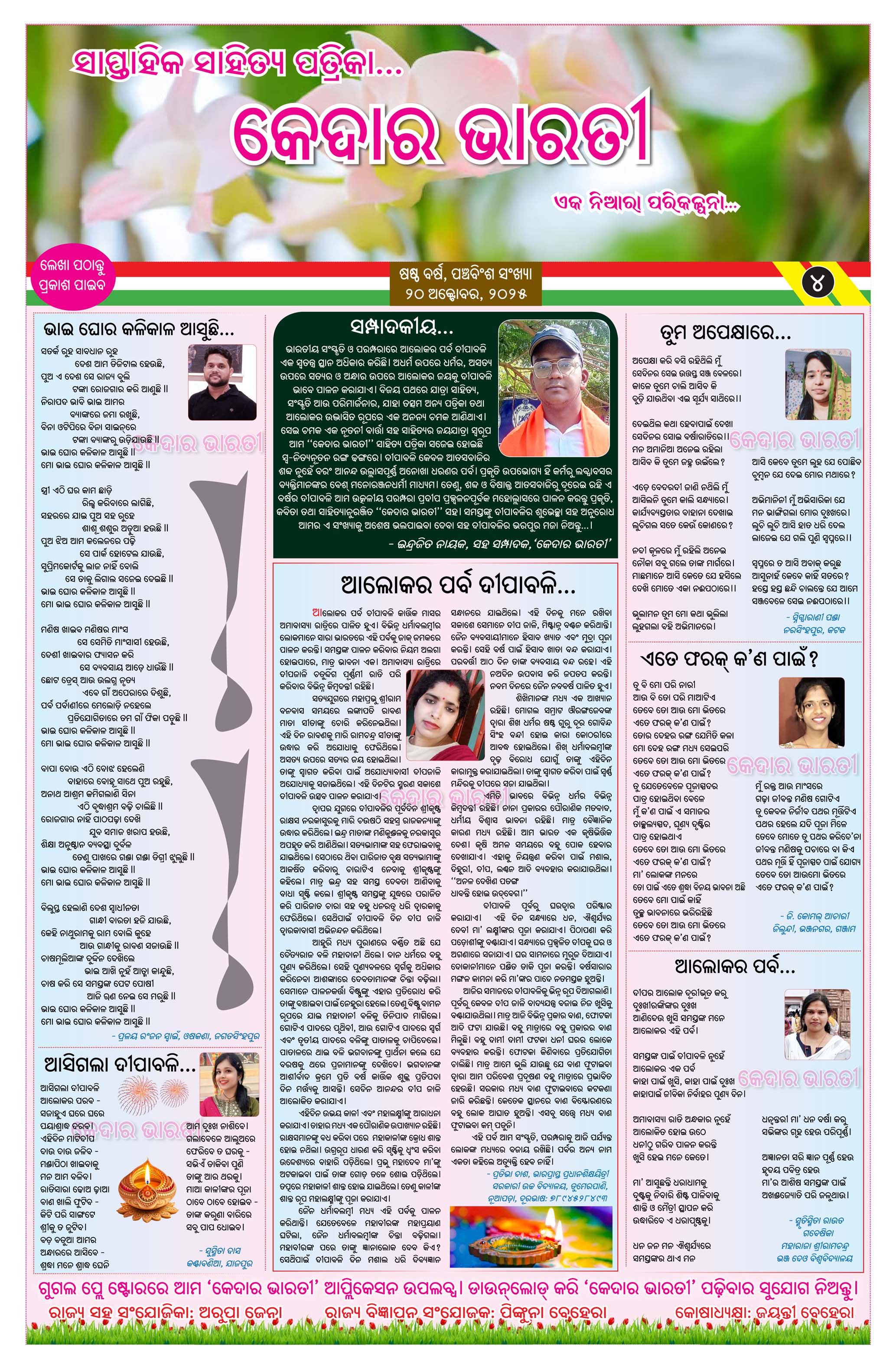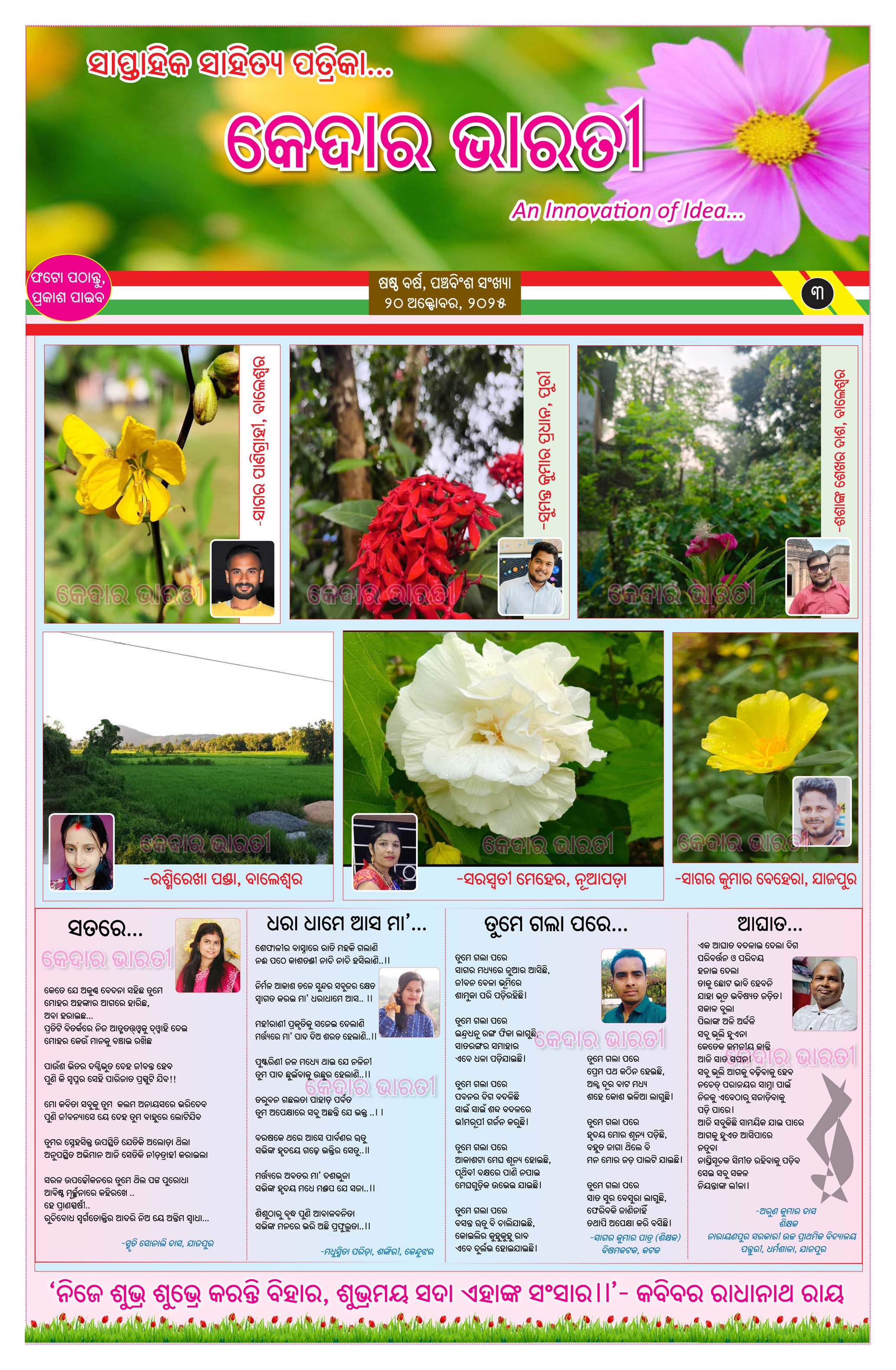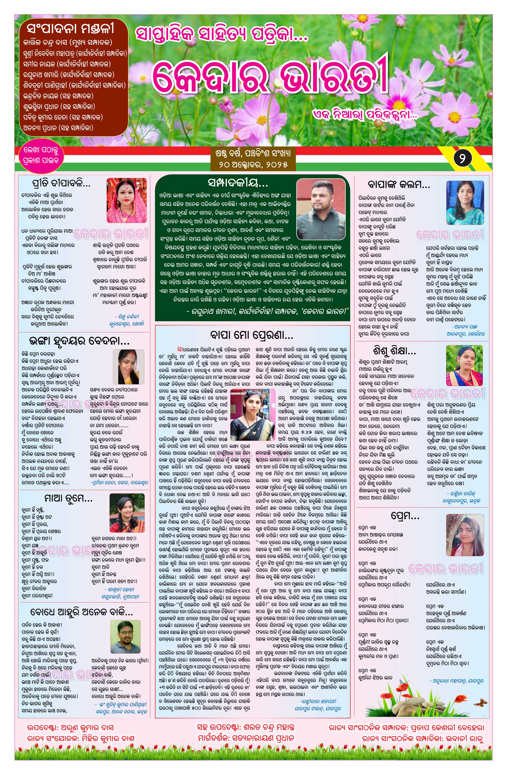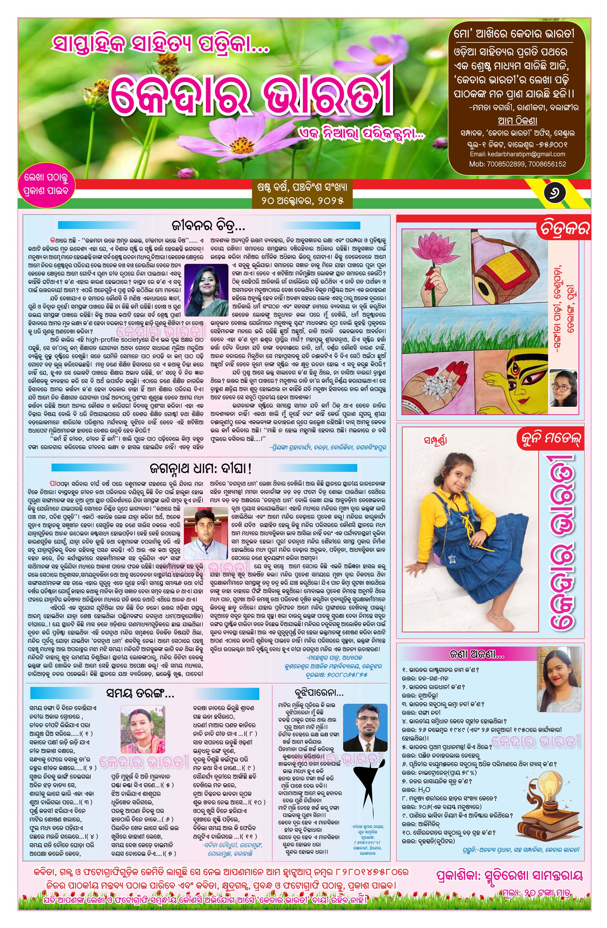 ପ୍ରକାଶ ପାଇଲା କେଦାର ଭାରତୀ ସାପ୍ତାହିକ ସାହିତ୍ୟ ପତ୍ରିକାର ଷଷ୍ଠ ବର୍ଷର ପଞ୍ଚବିଂଶ ସଂଖ୍ୟା। ଏହି ସଂଖ୍ୟାଟି ପାଠକୀୟ ରୁଚି ଅନୁଯାୟୀ ଉପସ୍ଥାପନ କରାଯାଇଛି। ଏଥିରେ ଏକ ସୁନ୍ଦର ପ୍ରଚ୍ଛଦ ସାଙ୍ଗକୁ କବିତା,ଗଳ୍ପ ଓ ପ୍ରବନ୍ଧଗୁଡ଼ିକର ସୁନ୍ଦର ଅଳଙ୍କରଣ କରଯାଇଥିବା ବେଳେ ବିଶେଷ କରି ଚିତ୍ରାଙ୍କନ ଓ କୁନି ମଡେଲ ଇତ୍ୟାଦିକୁ ସ୍ଥାନିତ କରାଯାଇଛି। ତେବେ ପତ୍ରିକାର ସ୍ୱତନ୍ତ୍ରତା ବଜାୟ ରଖିବା ପାଇଁ ଆମେ ଏଥିରେ ଜଳାଙ୍କ(ୱାଟର ମାର୍କ) ରଖିଛୁ। ଆଶା କରୁଛୁ ଏହି ସଂଖ୍ୟାଟି ପାଠକୀୟ କ୍ଷୁଧା ମେଣ୍ଟାଇବାରେ ସଫଳ ହେବ।